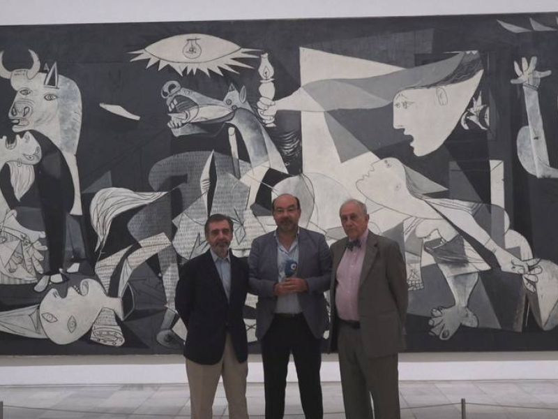 El director del Reina Sofía y el ex diplomático español, Inocencia Arias, han acompañado a Expósito en el recorrido por esta exposición cuyo destino es el Guernica, precisamente este miércoles 26 de abril, se cumple 80 años de aquel bombardeo que llevó al pinto malagueño a reflejar el horror de la guerra en este lienzo.