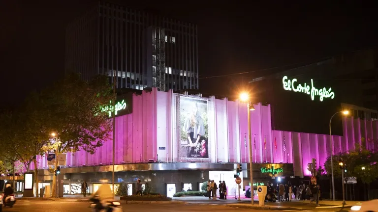 Las fachadas de El Corte Inglés se iluminan de rosa para celebrar el Día Mundial contra el Cáncer de Mama