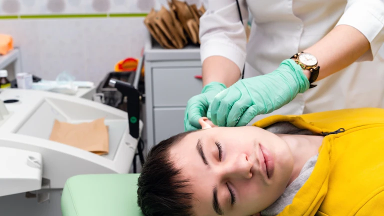 Otorrinolaringólogo realizando un examen otorrinolaringológico a un niño durante un chequeo médico en su consultorio