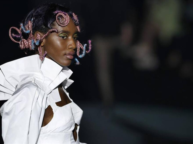 Por primera vez, este diseñador milenial presenta un estampado propio con el logo de la marca y entre las siluetas destaca la de "reloj de arena" como plasma en americanas de influencia motera, una prenda estructurada de especial belleza cuya clienta final son las mujeres de la generación zeta.