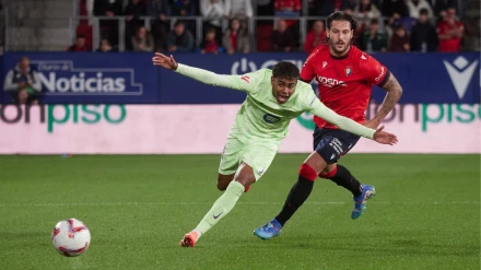 Pase en largo para el extremo de Osasuna que gana la carrera a su par y sienta a Iñaki Peña con una brutal pisada para marcar a puerta vacía el segundo.
