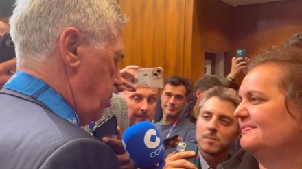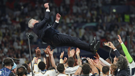 El técnico del Real Madrid celebró en el micrófono de Arancha Rodríguez la Decimoquinta del equipo blanco.