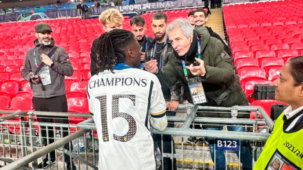 Manolo Lama charló con Eduardo Camavinga en la fiesta del Real Madrid sobre el césped de Wembley tras la conquista de la Décimoquinta.
