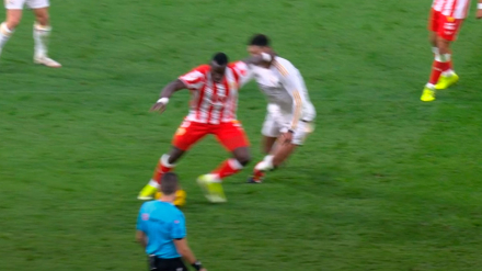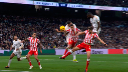 Robo de balón de Dion Lopy a Jude Bellingham y la jugada acaba con gol de Arribas, pero en la revisión se pita manotazo del jugador del Almería.