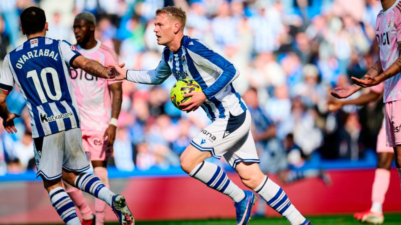 Buena pared por la izquierda de la Real Sociedad que acaba con un centro preciso de Sergio Gómez que remata Oskarsson, completamente solo, a las mallas.
