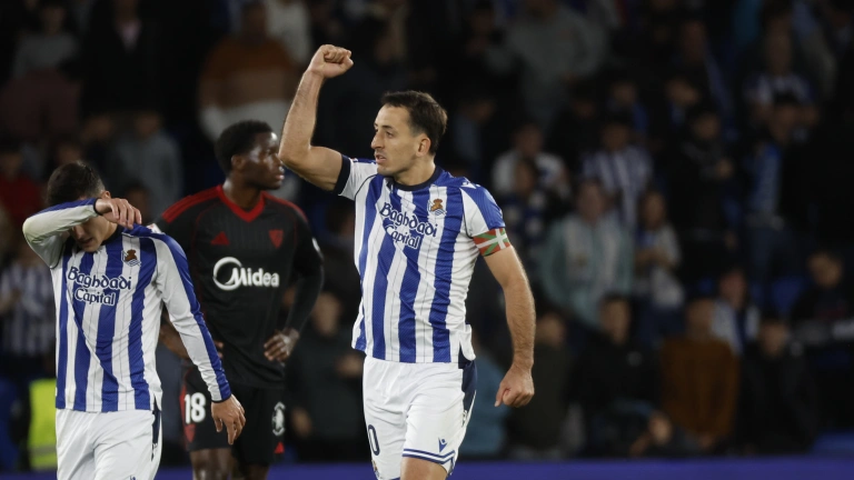 Saque de banda a favor de la Real Sociedad, balón que le cae a Brais Méndez que cede el balón a Oyarzabal que remata a la media vuelta y marca su segundo gol del partido.