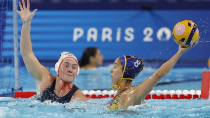 Una de las veteranas de la selección femenina de waterpolo celebra la victoria en los Juegos Olímpicos en el micrófono de José Luis Corrochano.