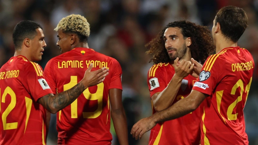 En la escuadra la puso Cucurella para estrenarse como goleador a lo grande. Tras nueva jugada de Lamine Yamal y un rechace que enganchó con potencia de un zurdazo perfecto. Era el minuto 30, partido sentenciado. El mensaje que España quería lanzar a sus rivales de grupo ganó contundencia siete minutos después, cuando sacó provecho del poderío aéreo de Mikel Merino tras un saque de esquina de Lamine Yamal.