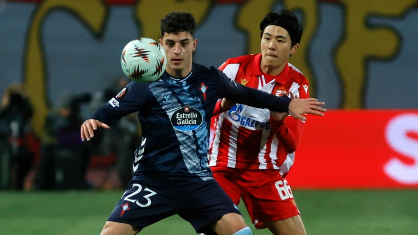 Hugo Álvarez protege el balón ante Youngwoo Seol durante el Estrella Roja - Celta, de la Europa League