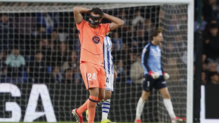 SAN SEBASTIÁN, 18/01/2026.- El jugador del Barcelona Eric García, durante el partido de LaLiga EA Sports que Real Sociedad y FC Barcelona disputan este domingo en el estadio de Anoeta, en San Sebastián. EFE/ Juan Herrero