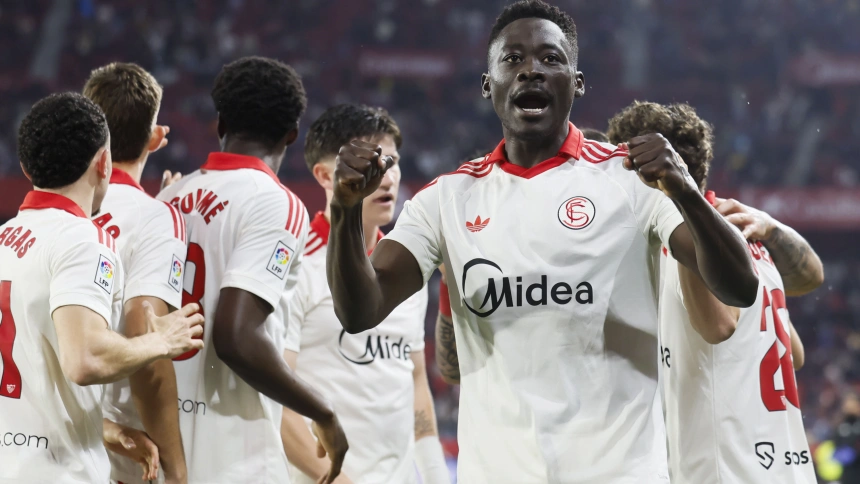 SEVILLA, 11/04/2026.- El delantero del Sevilla Akor Adams (d) celebra tras marcar el 1-0, durante el partido de LaLiga de fútbol que Sevilla FC y Atlético de Madrid disputan este sábado en estadio Ramón Sánchez-Pizjuán. EFE/José Manuel Vidal