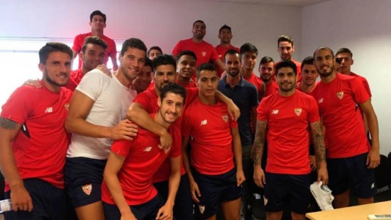 Los jugadores del Sevilla durante una charla antes del encuentro
