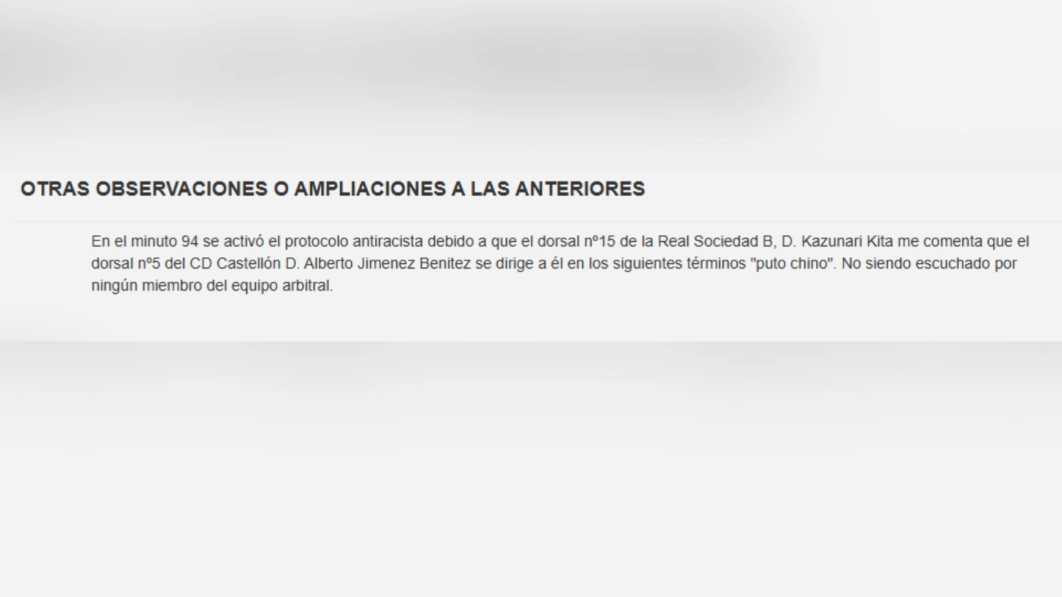 Y es que según el acta arbitral, Kita le comentó que Alberto Jiménez le dijo "p*** chino". Unas palabras que, según el propia acta, no fueron escuchadas por ningún miembro del equipo arbitral.