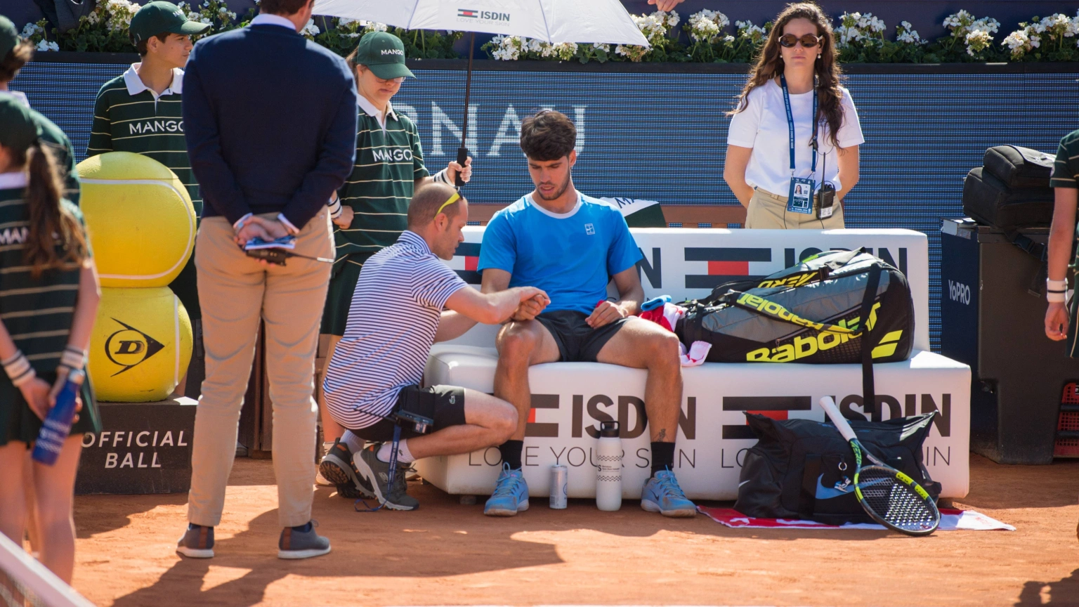 Carlos Alcaraz, recibiendo asistencia médica en el Godó