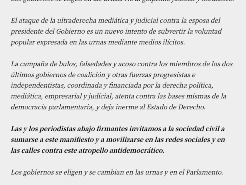 Los gobiernos se eligen en las urnas. No al golpismo judicial y mediático. El ataque de la ultraderecha mediática y judicial contra la esposa del presidente del Gobierno es un nuevo intento de subvertir la voluntad popular expresada en las urnas mediante medios ilícitos. La campaña de bulos, falsedades y acoso contra los miembros de los dos últimos gobiernos de coalición y otras fuerzas progresistas e independentistas, coordinada y financiada por la derecha política, mediática, empresarial y judicial, atenta contra las bases mismas de la democracia parlamentaria, y deja inerme al Estado de Derecho.