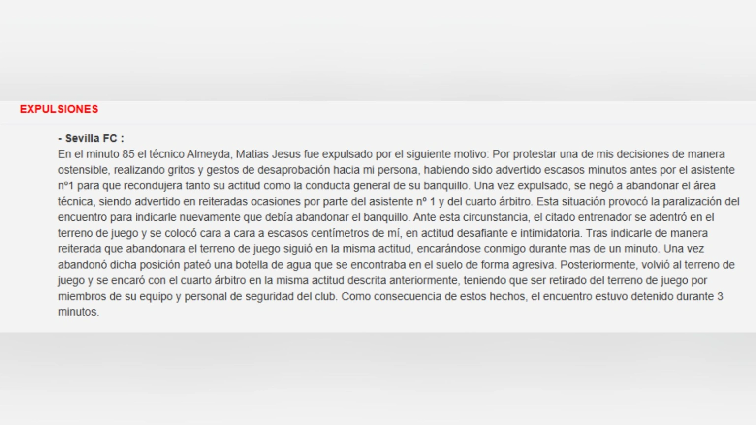 En el minuto 85 del Sevilla - Alavés, Matías Almeyda fue expulsado por Galech Apezteguía. Una tarjeta roja que el colegiado ha explicado en el acta arbitral de la siguiente manera: "El técnico fue expulsado por protestar una de mis decisiones de manera ostensible, realizando gritos y gestos de desaprobación hacia mi persona, habiendo sido advertido escasos minutos antes por el asistente nº1 para que recondujera tanto su actitud como la conducta general de su banquillo".
