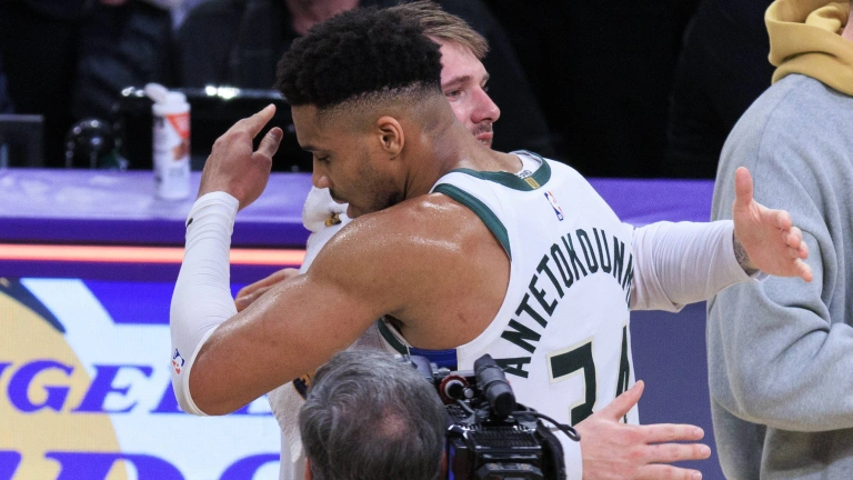 Giannis Antetokounmpo se abraza a Luka Doncic tras el partido entre Bucks y Lakers.
