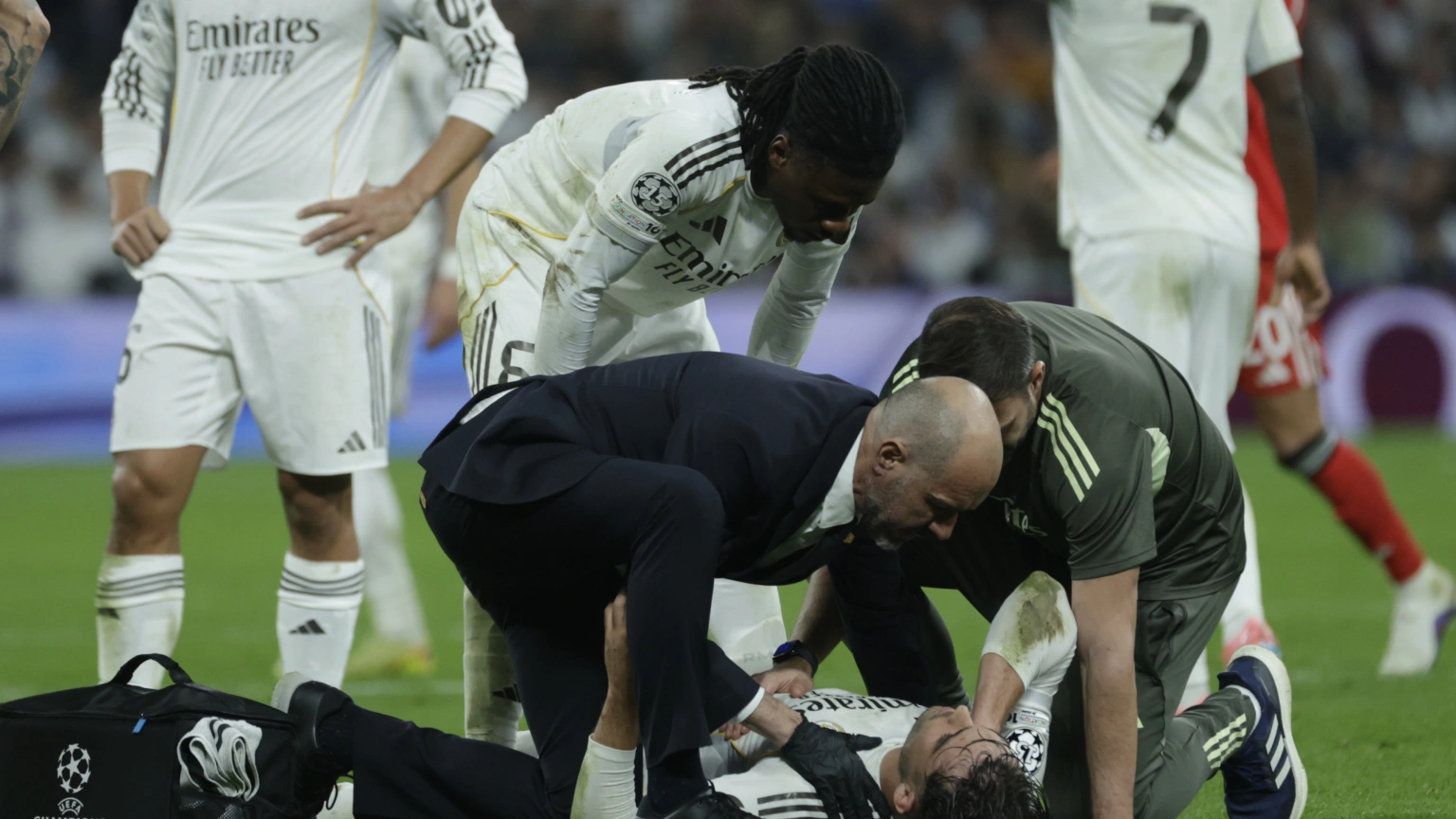 Raúl Asencio, atendido durante el Real Madrid-Benfica