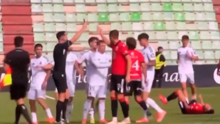 La brutal patada de un jugador del Castilla a uno del Mérida que ha provocado una espectacular tangana y la expulsión de Arbeloa
