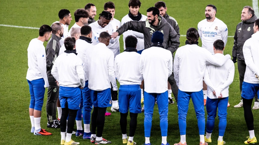 Arbeloa, junto con su plantilla, antes de un encuentro de Champions