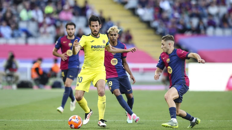 Dani Parejo (Villarreal CF) controla el balón mientras es defendido por Lamine Yamal (FC Barcelona) y Fermín López (FC Barcelona) durante el partido de LaLiga entre FC Barcelona y Villarreal CF en el Olímpic Lluís Companys, el 18 de mayo de 2025 en Barcelona, España.