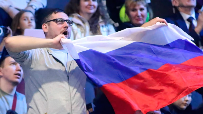 Un aficionado ruso agita la bandera de su país dentro de un pabellón