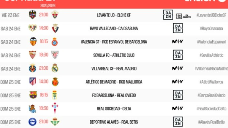 La jornada dominical se abrirá en el Riyadh Air Metropolitano con el Atlético de Madrid-RCD Mallorca (14.00) y posteriormente será turno del actual campeón de Liga, el FC Barcelona, que recibirá al Real Oviedo (16.15). Se cerrará el domingo 25 de enero con el Real Sociedad-Celta (18.30) y el Deportivo Alavés-Real Betis (21.00). Para el lunes 26 de enero quedará el Girona FC-Getafe CF (21.00).