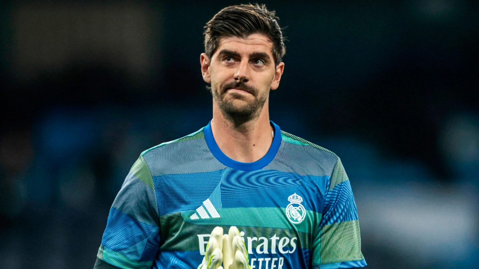 Thibaut Courtois calienta antes de disputar el Manchester City-Real Madrid