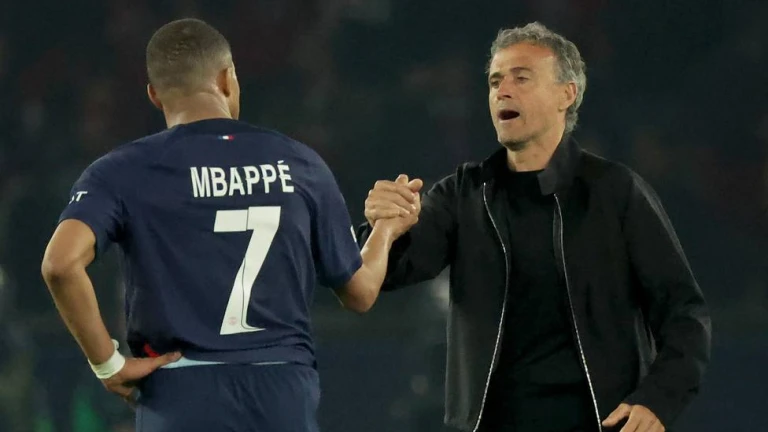 Paris (France), 07/05/2024.- PSG head coach Luis Enrique shakes hands with forward Kylian Mbappe after the UEFA Champions League semi-finals, 2nd leg soccer match of Paris Saint-Germain against Borussia Dortmund, in Paris, France, 07 May 2024. PSG lost the match 0-1 and the tie 0-2 on aggregate with Borussia Dortmund advancing to the final. (Liga de Campeones, Francia, Rusia) EFE/EPA/TERESA SUAREZ