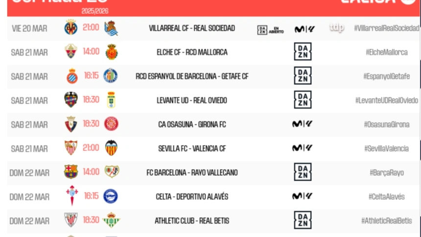 Horarios de la 29ª jornada en Primera División