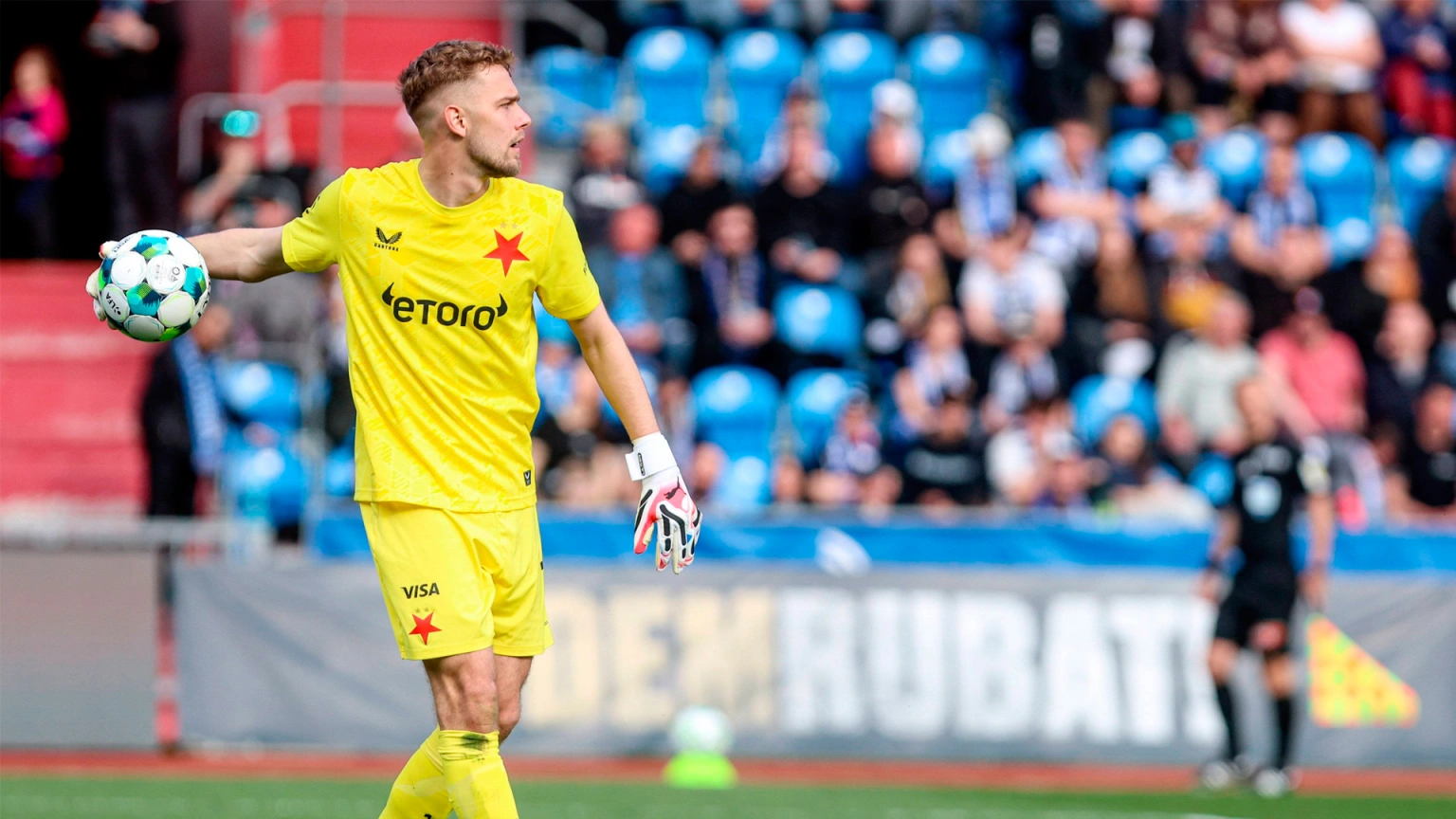 Jakub Markovic, portero del Slavia de Praga, saca un balón de su portería