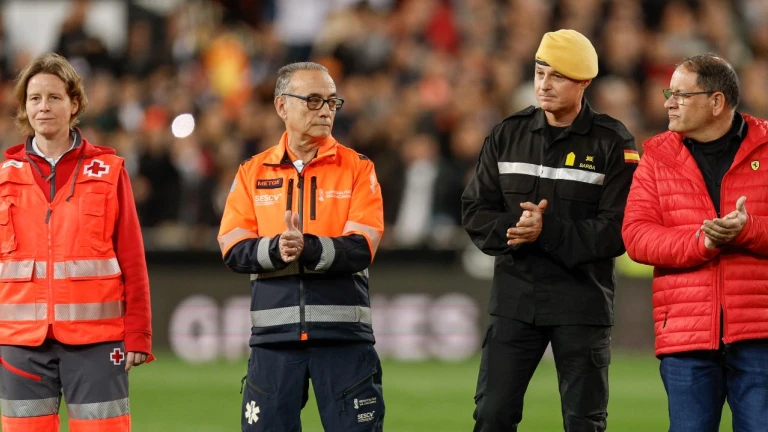 Entraron al campo miembros de los cuerpos de Policía Local, Policía Nacional, Bomberos, UME, Cruz Roja, 112 y Protección Civil, aplaudidos por un estadio puesto en pie.