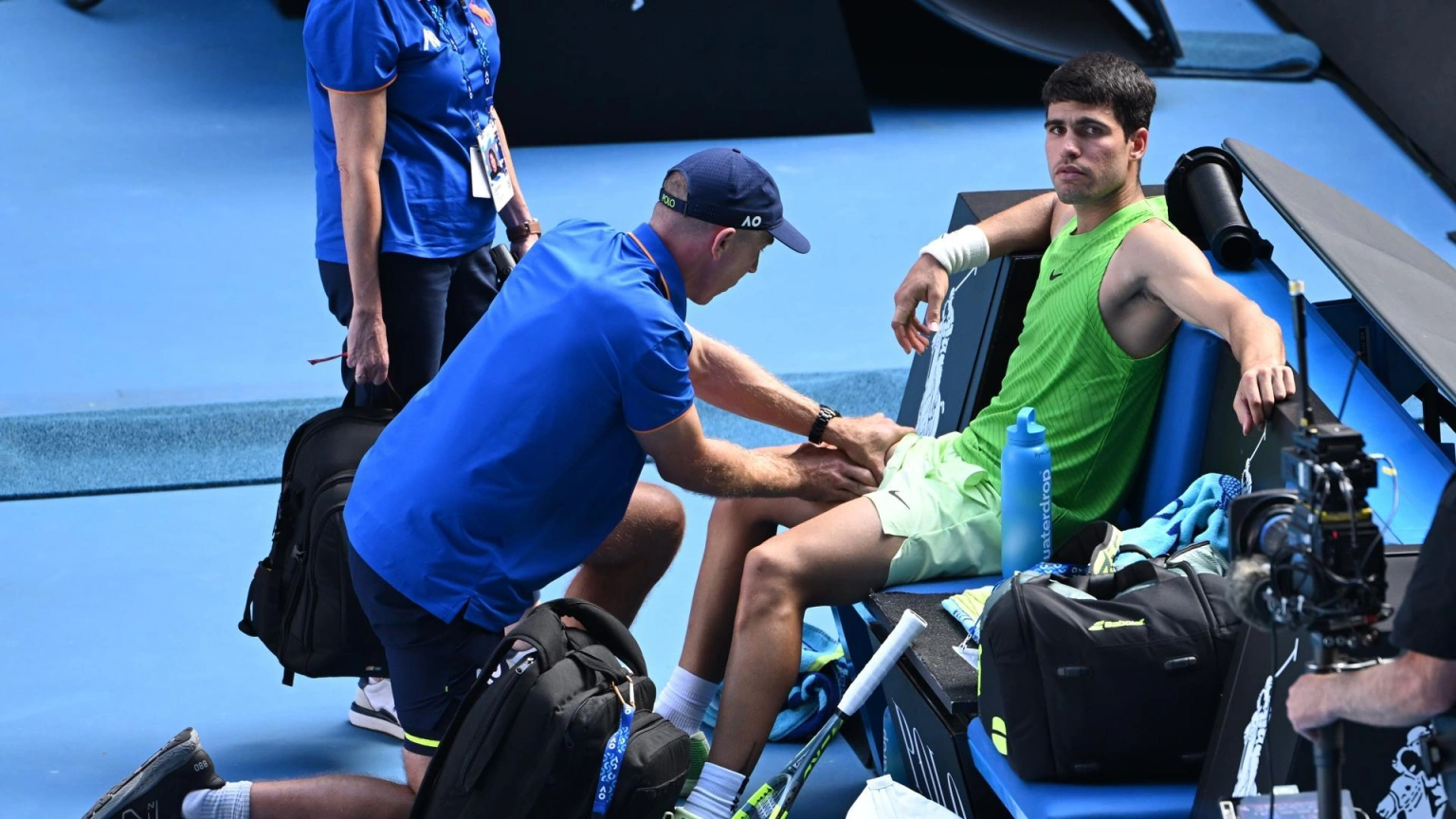Carlos Alcaraz recibe un masaje muscular en medio de su encuentro contra Zverev