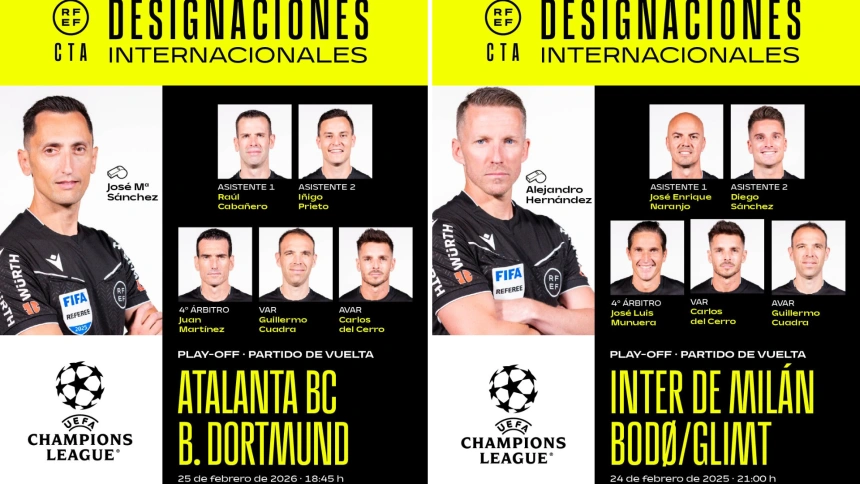 Por un lado, este martes, Alejandro Hernández Hernández dirigirá el Inter-Bodo Glimt y por otro lado, José María Sánchez Martínez arbitrará este miércoles el Atalanta-Borussia Dortmund.