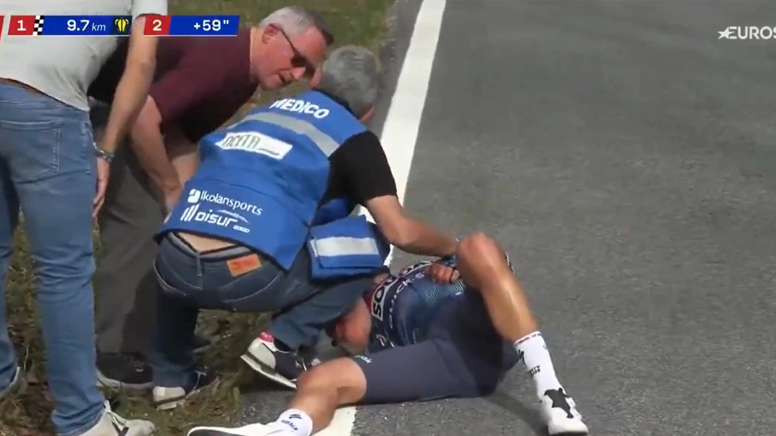 Mikel Landa, en el suelo después de su accidente con el coche médico en la Itzulia.