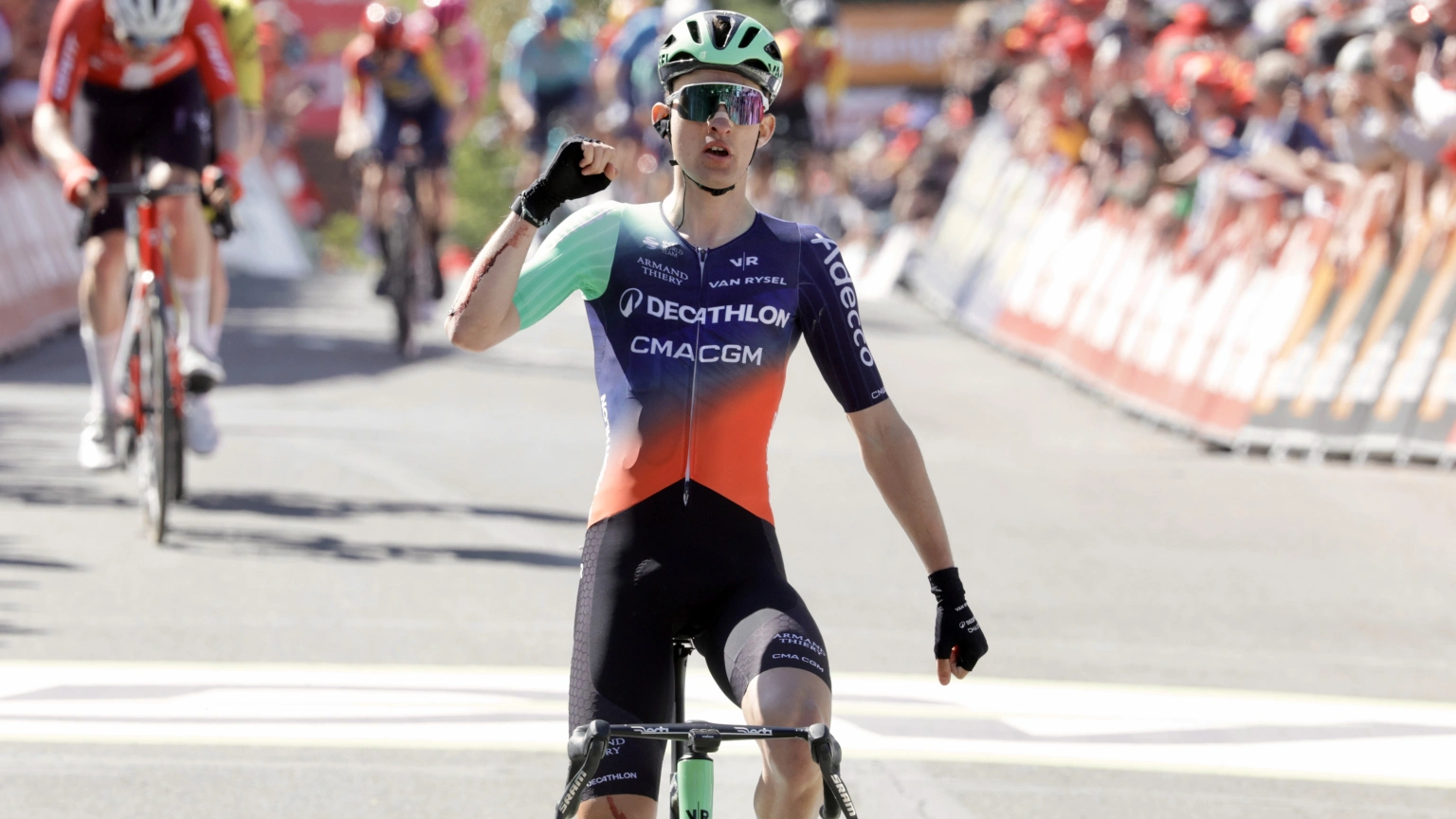 El joven Paul Seixas celebra su victoria en el Muro de Huy este miércoles.