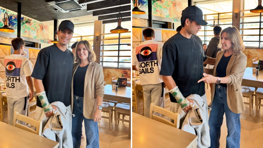 El joven tenista murciano, número 2 del ranking ATP, estuvo este lunes en el restaurante 'Los Chopos', de camino a la gala de los Laureus 2026 - que se entregan este lunes en Madrid - con la muñeca completamente inmovilizada mediante una férula rígida. La imagen ha sido compartida por la propia cuenta del restaurante en redes sociales.