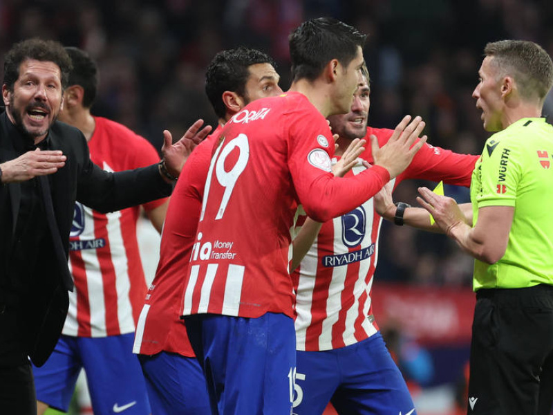 Los jugadores del Atlético de Madrid recriminando al árbitro Hernández Hernández.