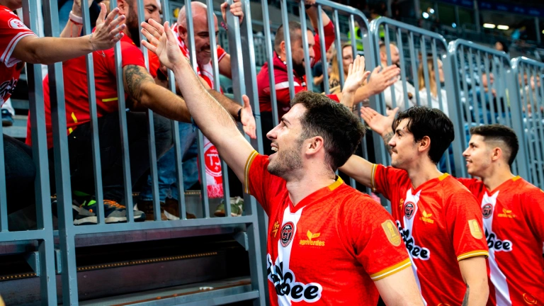 Los jugadores de Jimbee Cartagena saludan a los aficionados desplazados a Polonia