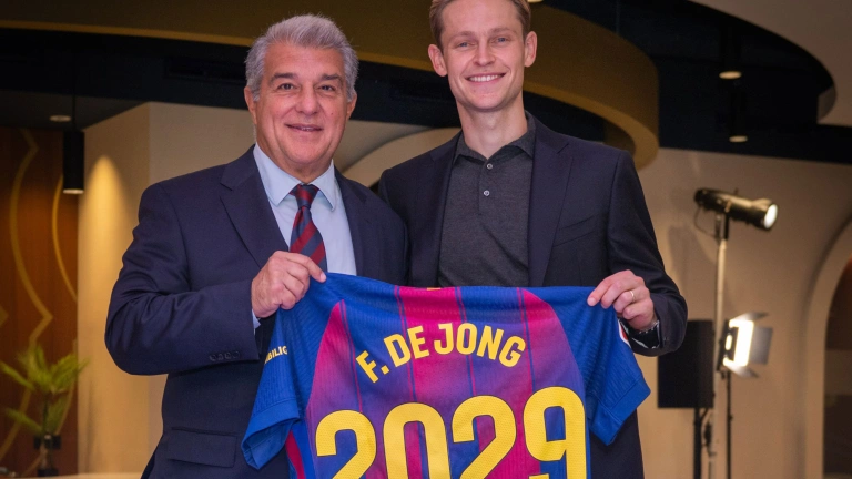 El centrocampista neerlandés Frenkie de Jong ha firmado su renovación con el FC Barcelona hasta 2029, en un acto que ha tenido lugar en la oficina comercial del club, arropado por su familia y acompañado por el presidente blaugrana, Joan Laporta. De Jong renueva su contrato, que finalizaba este próximo verano, hasta 2029 y con una cláusula de rescisión de 500 millones de euros, mayor a la que tenía firmada anteriormente.