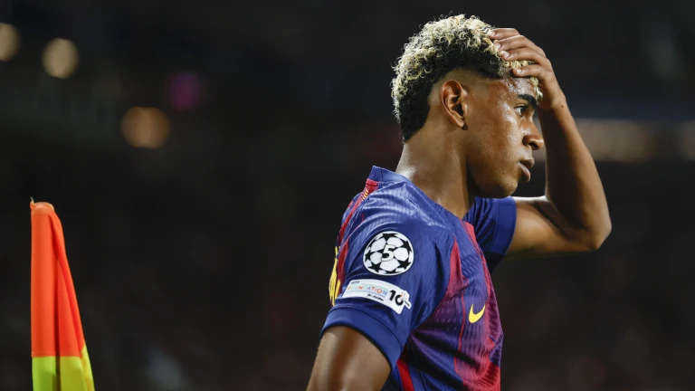 Lamine Yamal se lamenta durante el partido en Champions contra el PSG.