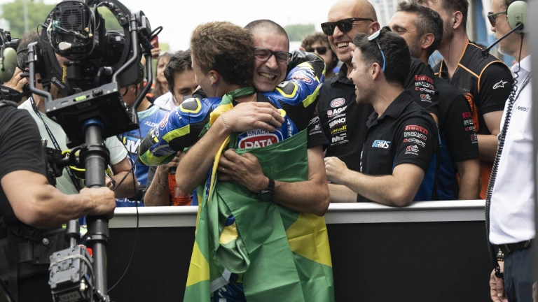 Diogo Moreira celebra su victoria con los miembros de su equipo.