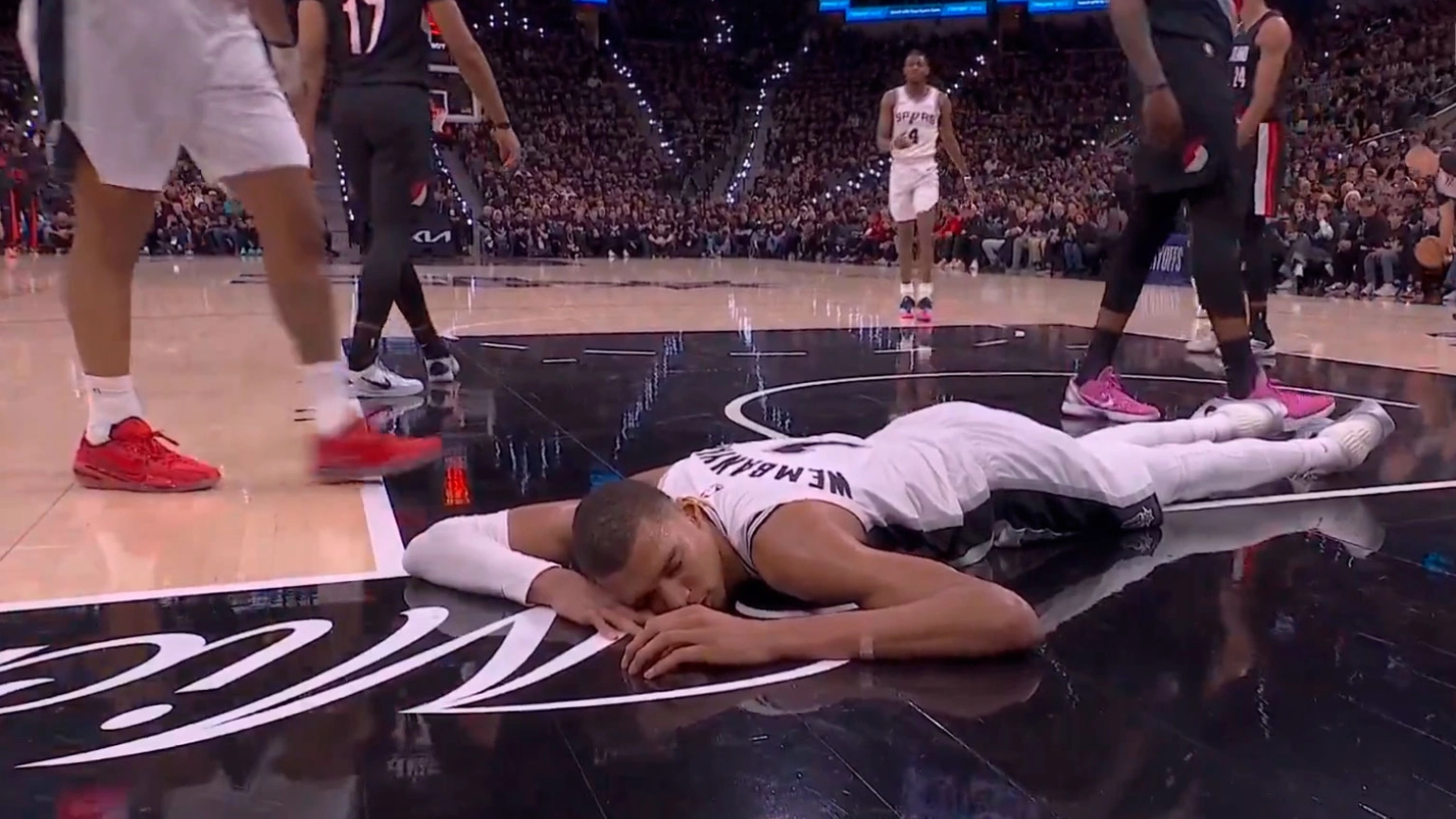 Wembanyama se retiró en el segundo cuarto tras una aparatosa caída cuando se dirigía a canasta, en una acción defendida por Jrue Holiday, que resultó en un fuerte impacto en la cara al pívot francés. La estrella de los Spurs, se quedó tendido durante unos segundos en el suelo, intentó levantarse sin éxito y se quedó sentado con cara de confundido hasta que le atendieron. No pudo volver al juego ya que se activó el protocolo de conmoción cerebral de la NBA, que obliga a un periodo de inactividad de 48 horas tras el impacto. Por lo tanto, es duda para el tercer partido de la serie que se jugará en la madrugada del sábado (04:30) en Portland.