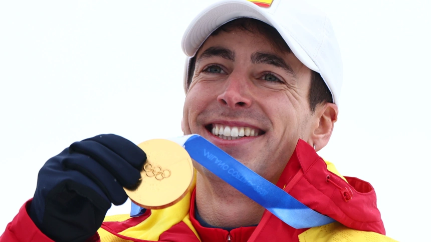 Oriol Cardona posa con la medalla de oro de campeón olímpico de Sprint Esquí de Montaña.