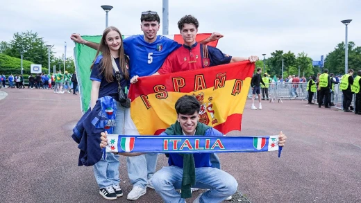 Las aficiones de España e Italia, rivales este jueves en la segunda jornada de la Eurocopa 2024, protagonizaron una tarde amistosas durante la previa al gran partido. La hermandad reinó y ambas partes con sus cánticos alegraron y sacaron de la calma a la tranquila localidad alemana de Gelsenkirchen.