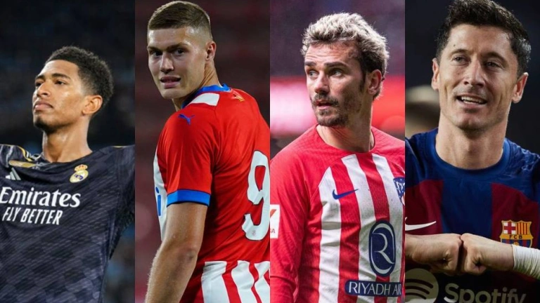 Composición de Bellingham, Dovbyk, Griezmann y Lewandowski