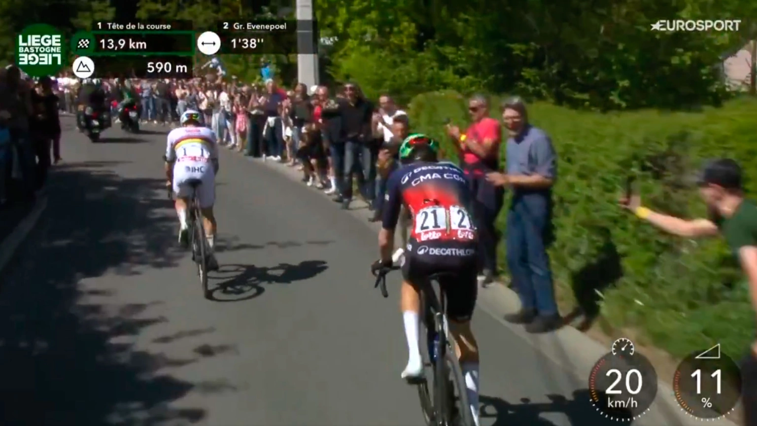Pogacar entró en la subida a la mítica Redoute en el segundo puesto, seguido muy de cerca por Paul Seixas. El que no mantuvo la posición fue Evenepoel, incapaz de seguir el ritmo marcado por Benoît Cosnefroy (UAE) al frente. Y, entonces, como en las dos ediciones anteriores, Tadej Pogacar atacó. A falta de casi 35 kilómetros para el final, el esloveno cambió el ritmo y solamente Paul Seixas, llamado a ser su sucesor, continuó a su rueda. El campeón del mundo y el joven francés subieron juntos los 900 metros restantes y coronaron juntos, sin que Pogacar pudiera soltarlo.