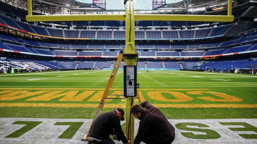 Los operarios adaptan el Bernabéu para el partido de fútbol americano entre Dolphins y Commanders.