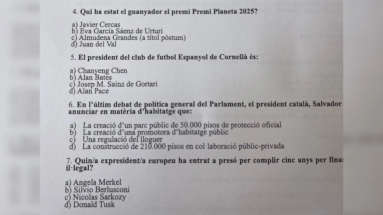 La pregunta en cuestión es la siguiente: "El president del club de futbol Espanyol de Cornellà és". Y viene acompañada de cuatro respuestas: Chanyeng Chen, Alan Bates, Josep M. Sainz de Gortari y Alan Pace.