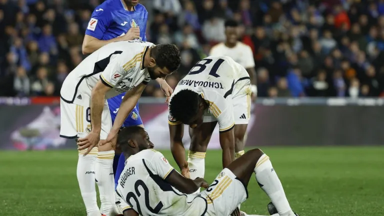 Rüdiger sufrió un golpe en el partido que enfrentó al Real Madrid con el Getafe en el Coliseum tras chocar con Mason Greenwood. El alemán no pudo jugar el derbi ante el Atlético y tras entrenar este viernes con el equipo, después de toda la semana entre algodones, se le ha diagnosticado la lesión que podría tenerle de baja unas dos semanas.